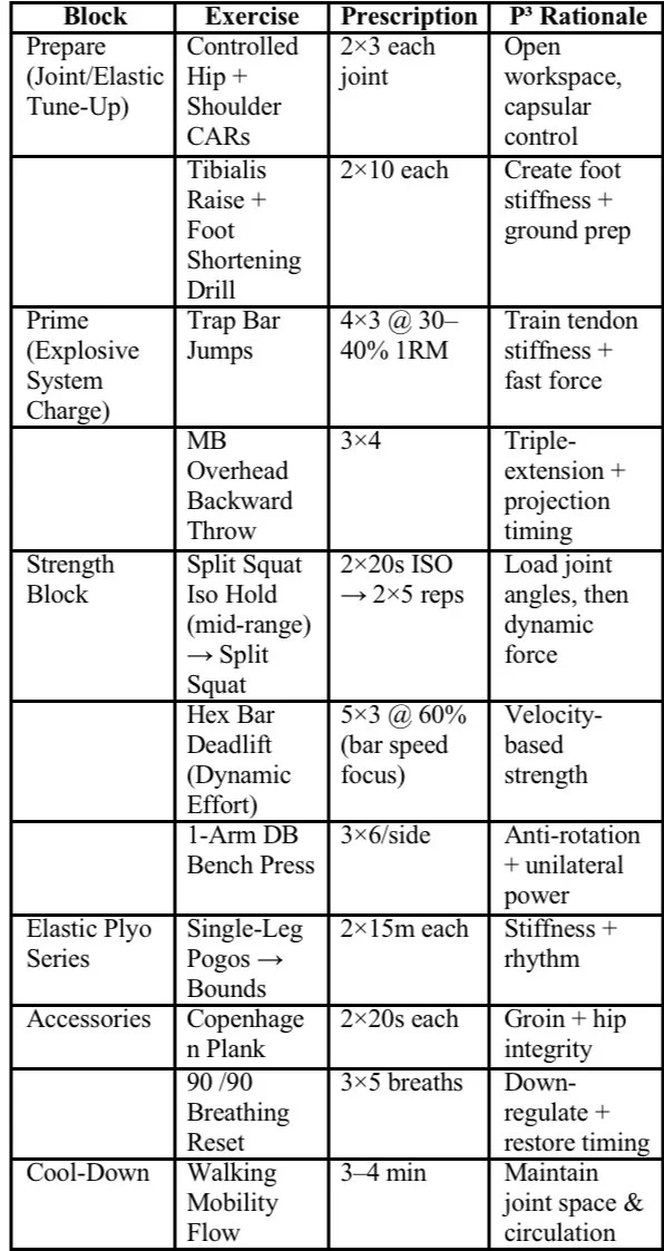 P³: Still builds strength and power but begins with joint + nervous system prep, uses specific angles, integrates timing + projection, and selects loads based on speed output, not just % of 1RM.