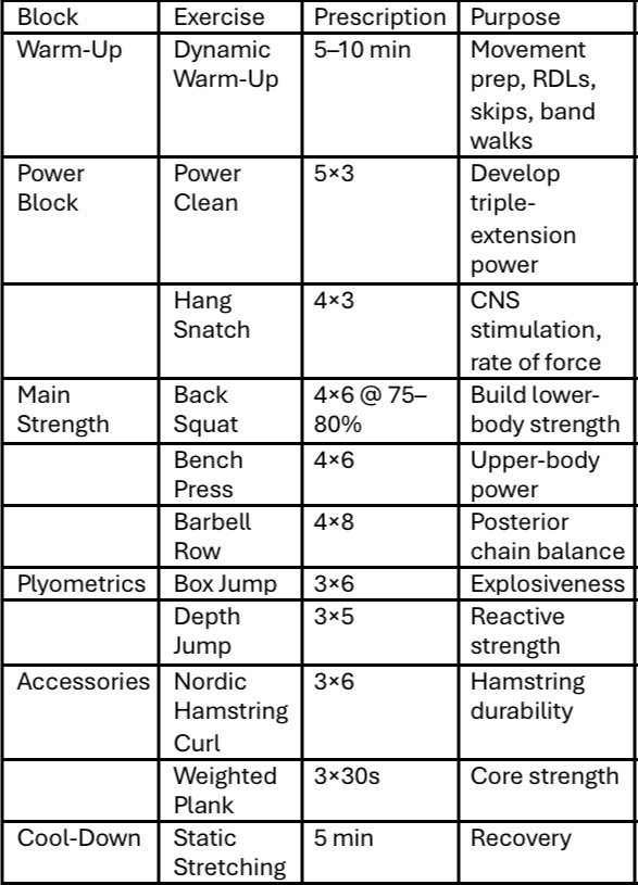 • Traditional: Barbell-heavy + Olympic lifts → power is developed but CNS may be overloaded.